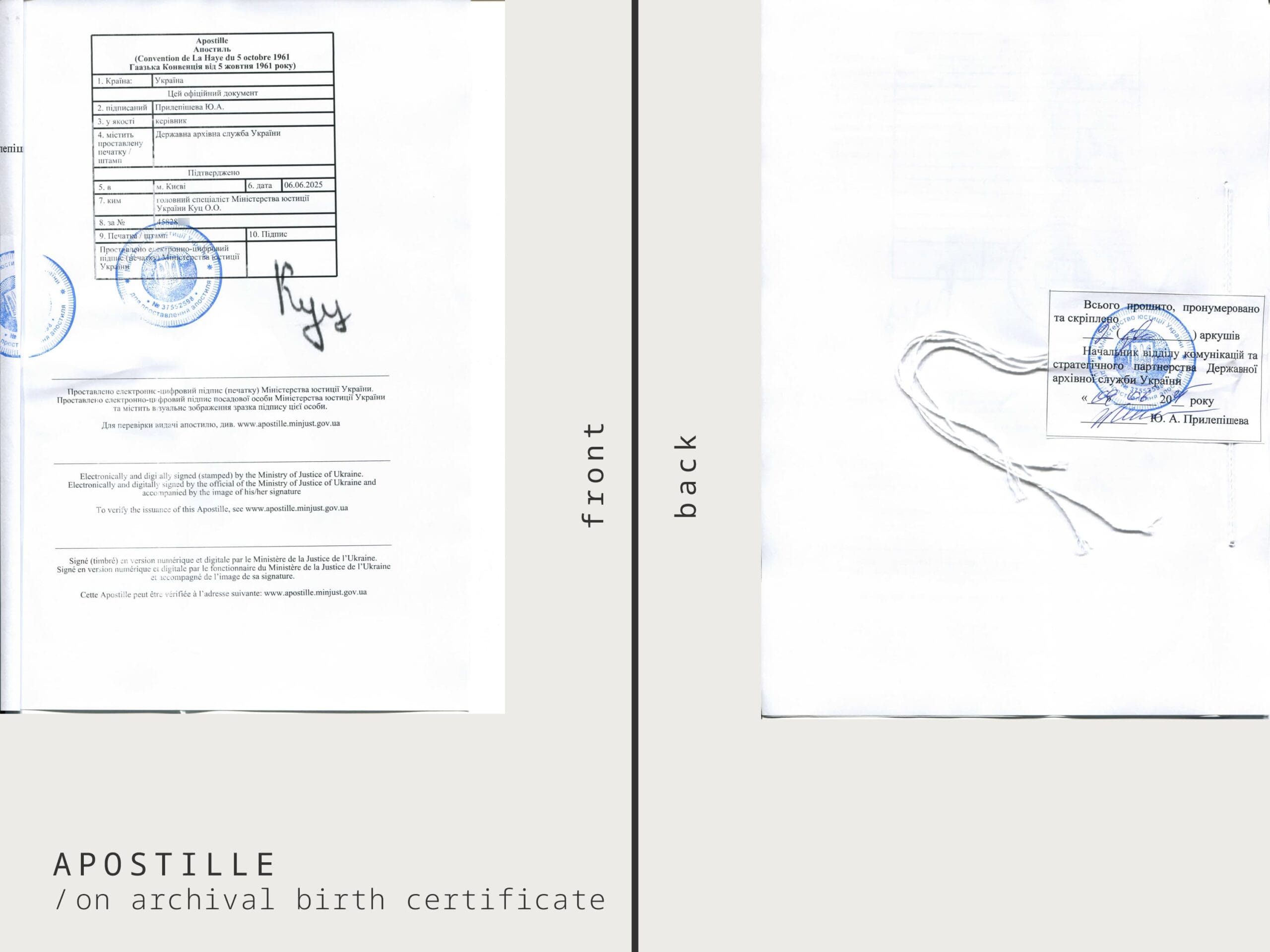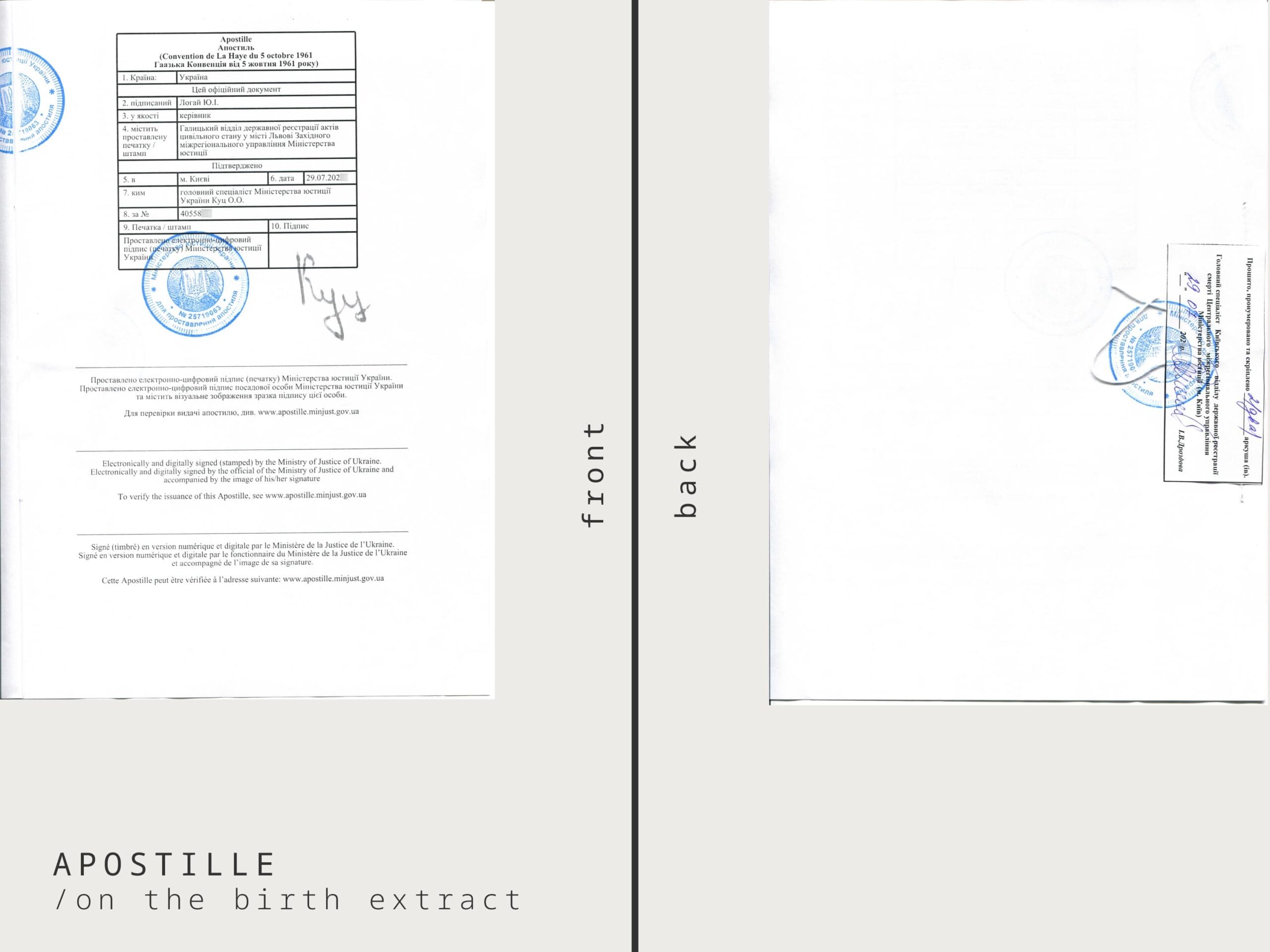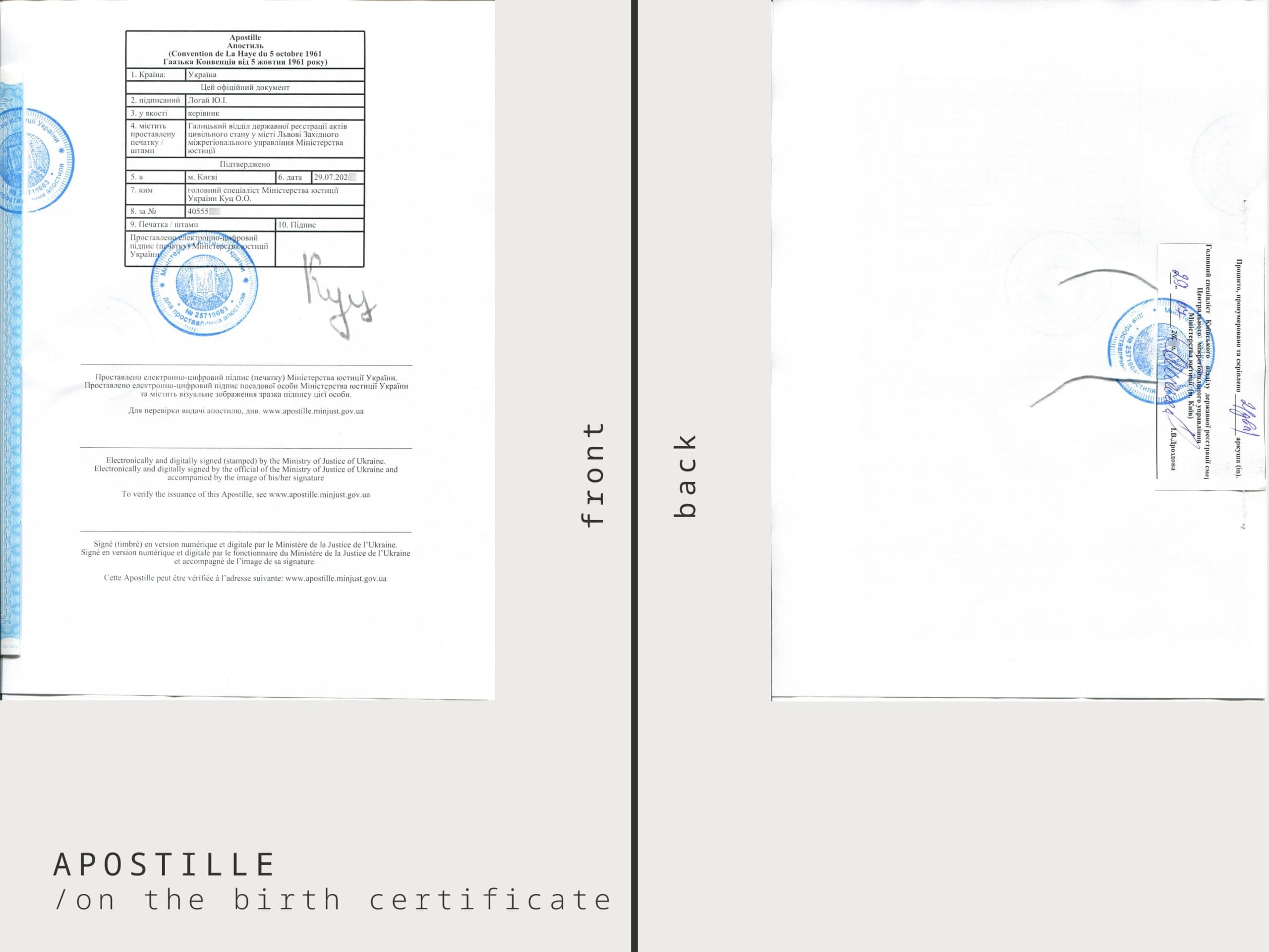 Full legalization for obtained birth certificates/extracts I received could be provided by request. Apostillization by Hague Convention 1961 is possible for birth certificates and birth extracts received from Ukrainian civil registry offices and for archival birth certificates. This additional service is paid separately.