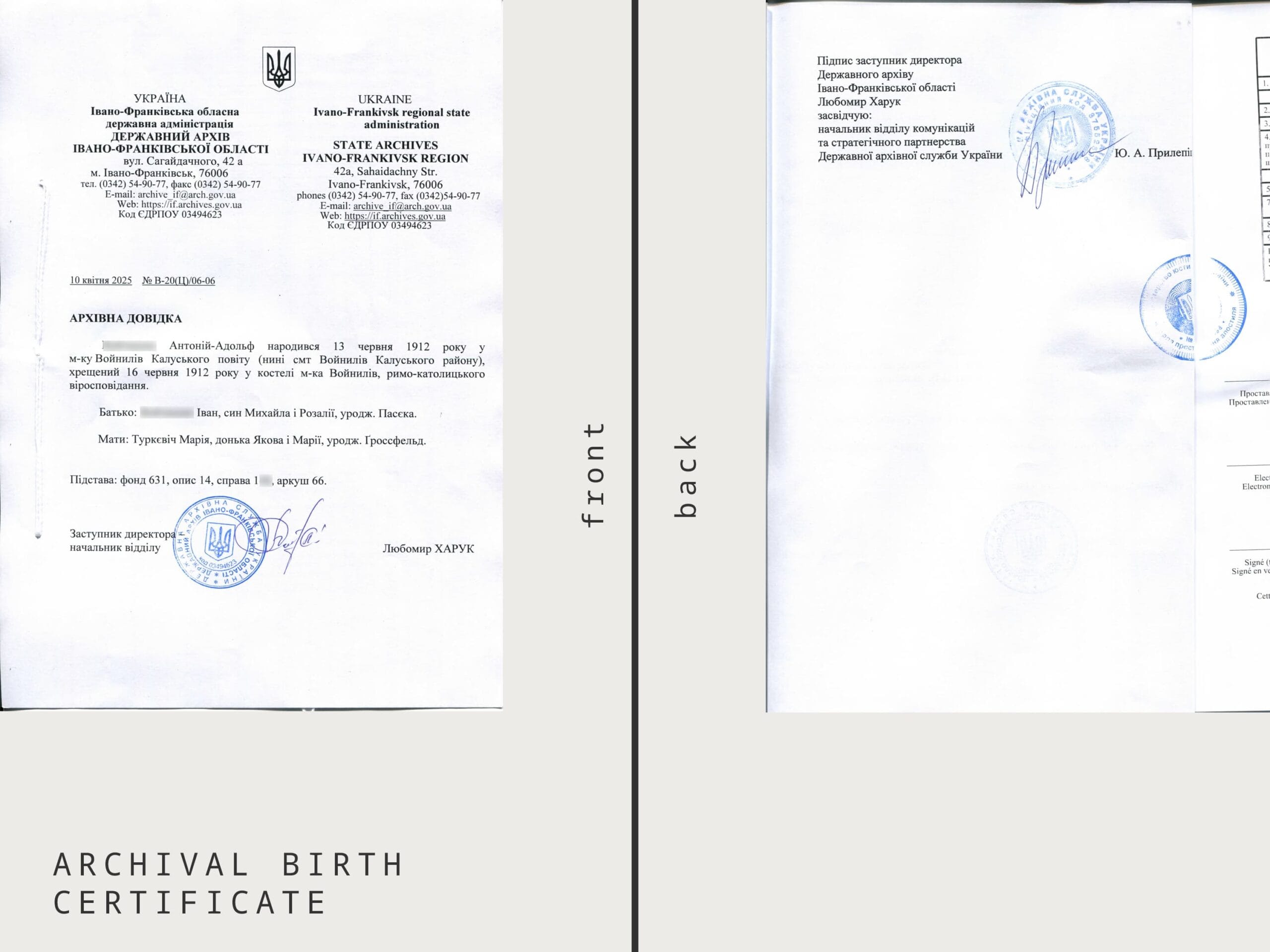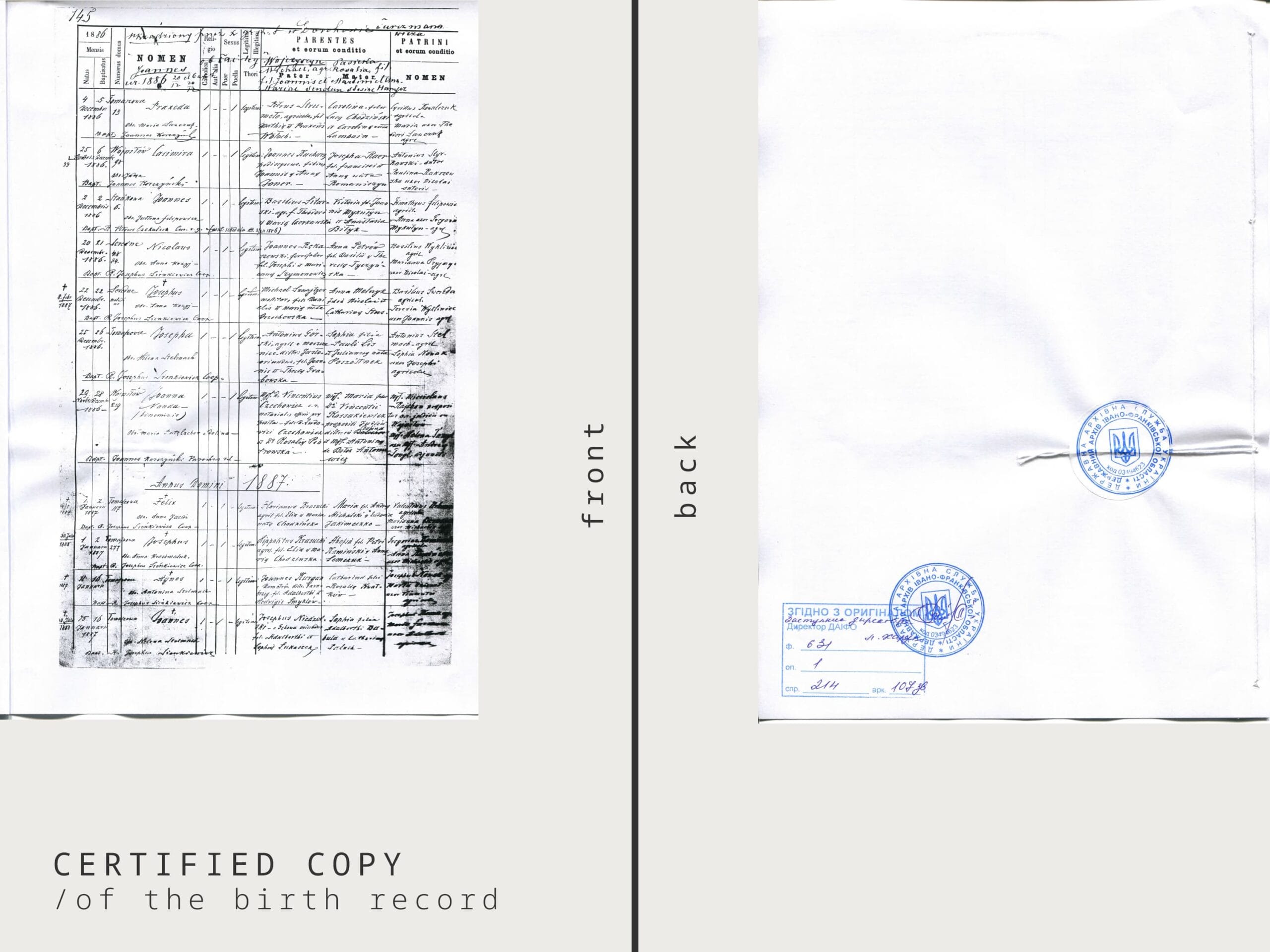 Thirdly, it’s a certified copy of the birth record with an archival birth certificate from Ukraine (for records older than 76 years), and contains all included information. In conclusion, type of birth document depends on your needs and legal requirements.