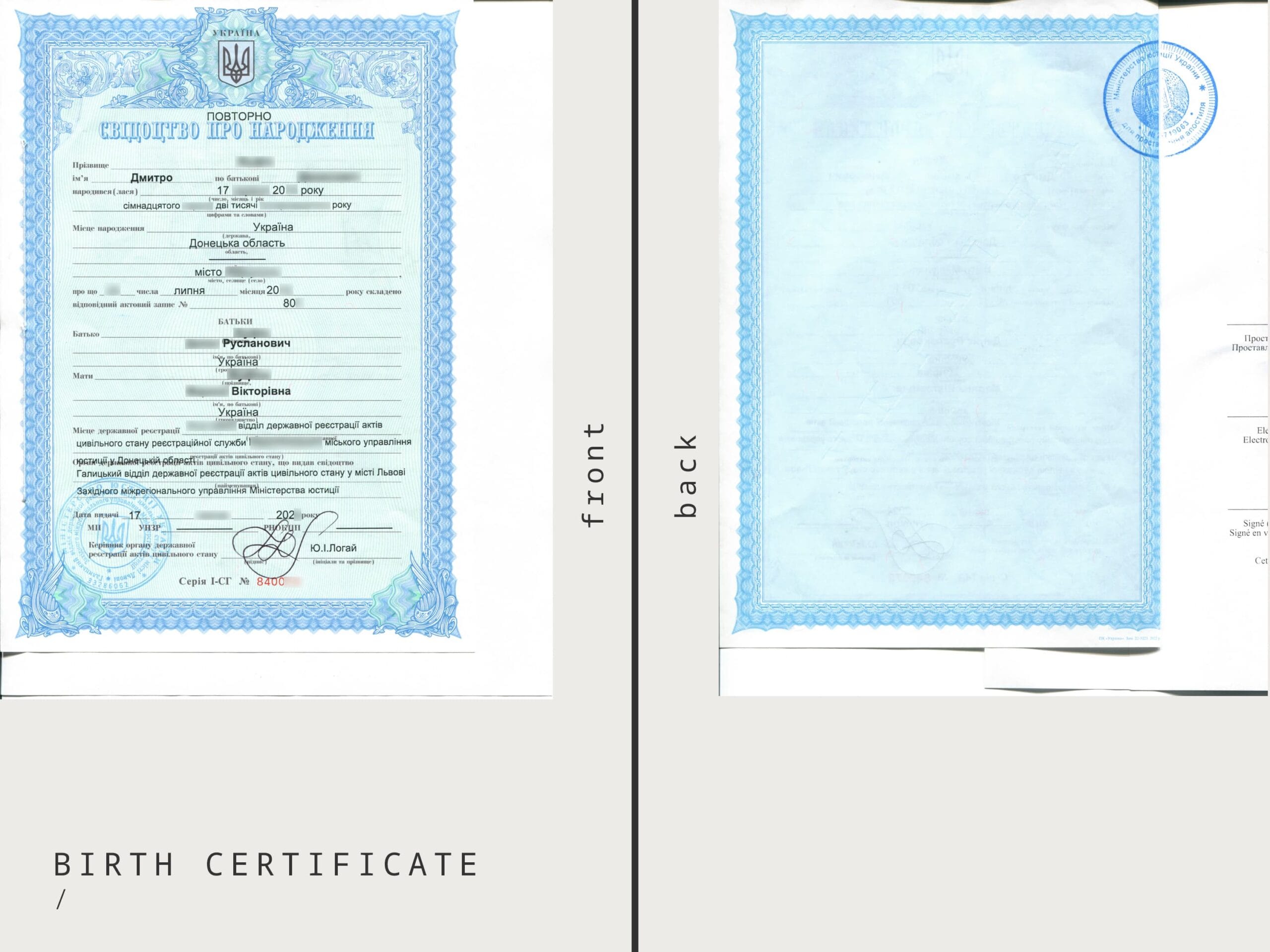 A certified copy of the birth record from Ukraine is an official copy (scanned copy or photocopy in paper form) of the original of some birth record with originality certification, issued by competent civil registration office or archival institution in Ukraine. Certified copies of birth records could be provided for birth acts taken place less than 76 years ago.