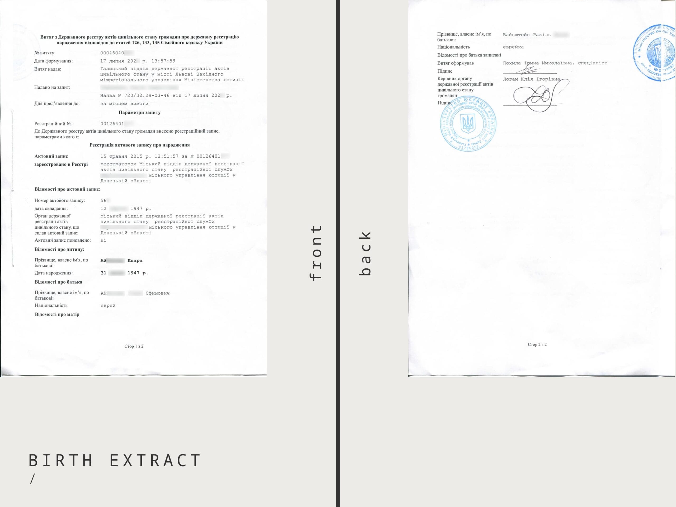 Secondly, it’s allowed to get birth extract in Ukraine (for records younger than 76 years) that contains additional information about the parent’s, like their nationality/ethnicity.